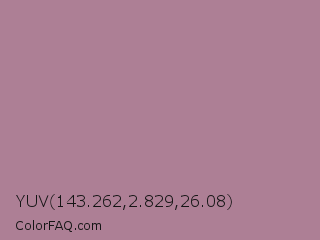 YUV 143.262,2.829,26.08 Color is a normal rose color and the nearest color is English Lavender #b48395. Hex code #ad7f95 and RGB value is rgb(173,127,149). In RGB color space, this color is composed of 68% red, 50% green, 58% blue, In CMYK color space, this color is composed of 0% cyan, 27% magenta, 14% yellow , 32% black , In HSL color space, this color has a hue angle of 331° , 22% saturation and 59% lightness.