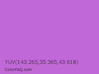 YUV 143.265,35.365,43.618 Color is a light purple color and the nearest color is Rich Lilac #b666d2. Hex code #c168d7 and RGB value is rgb(193,104,215). In RGB color space, this color is composed of 76% red, 41% green, 84% blue, In CMYK color space, this color is composed of 10% cyan, 52% magenta, 0% yellow , 16% black , In HSL color space, this color has a hue angle of 288° , 58% saturation and 63% lightness.