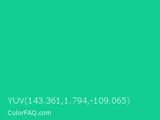 YUV 143.361,1.794,-109.065 Color is a normal green color and the nearest color is Caribbean Green #00cc99. Hex code #13ce93 and RGB value is rgb(19,206,147). In RGB color space, this color is composed of 7% red, 81% green, 58% blue, In CMYK color space, this color is composed of 91% cyan, 0% magenta, 29% yellow , 19% black , In HSL color space, this color has a hue angle of 161° , 83% saturation and 44% lightness.