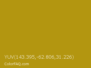 YUV 143.395,-62.806,31.226 Color is a normal yellow color and the nearest color is Sahara #b7a214. Hex code #b39610 and RGB value is rgb(179,150,16). In RGB color space, this color is composed of 70% red, 59% green, 6% blue, In CMYK color space, this color is composed of 0% cyan, 16% magenta, 91% yellow , 30% black , In HSL color space, this color has a hue angle of 49° , 84% saturation and 38% lightness.