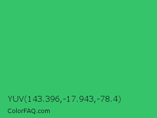 YUV 143.396,-17.943,-78.4 Color is a normal green color and the nearest color is UFO Green #3cd070. Hex code #36c46b and RGB value is rgb(54,196,107). In RGB color space, this color is composed of 21% red, 77% green, 42% blue, In CMYK color space, this color is composed of 72% cyan, 0% magenta, 45% yellow , 23% black , In HSL color space, this color has a hue angle of 142° , 57% saturation and 49% lightness.