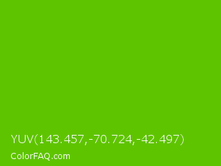 YUV 143.457,-70.724,-42.497 Color is a normal green color and the nearest color is Kelly Green #4cbb17. Hex code #5fc400 and RGB value is rgb(95,196,-0). In RGB color space, this color is composed of 37% red, 77% green, 0% blue, In CMYK color space, this color is composed of 52% cyan, 0% magenta, 100% yellow , 23% black , In HSL color space, this color has a hue angle of 91° , 100% saturation and 38% lightness.