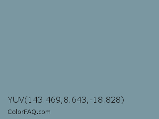 YUV 143.469,8.643,-18.828 Color is a normal blue color and the nearest color is Weldon Blue #7c98ab. Hex code #7a97a1 and RGB value is rgb(122,151,161). In RGB color space, this color is composed of 48% red, 59% green, 63% blue, In CMYK color space, this color is composed of 24% cyan, 6% magenta, 0% yellow , 37% black , In HSL color space, this color has a hue angle of 195° , 17% saturation and 55% lightness.
