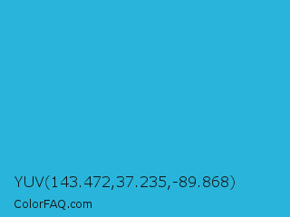 YUV 143.472,37.235,-89.868 Color is a normal cyan color and the nearest color is Scooter #2ebfd4. Hex code #29b5db and RGB value is rgb(41,181,219). In RGB color space, this color is composed of 16% red, 71% green, 86% blue, In CMYK color space, this color is composed of 81% cyan, 17% magenta, 0% yellow , 14% black , In HSL color space, this color has a hue angle of 193° , 71% saturation and 51% lightness.