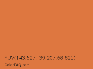YUV 143.527,-39.207,68.821 Color is a normal orange color and the nearest color is Red Damask #da6a41. Hex code #de7740 and RGB value is rgb(222,119,64). In RGB color space, this color is composed of 87% red, 47% green, 25% blue, In CMYK color space, this color is composed of 0% cyan, 46% magenta, 71% yellow , 13% black , In HSL color space, this color has a hue angle of 21° , 71% saturation and 56% lightness.