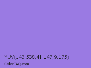 YUV 143.538,41.147,9.175 Color is a light indigo color and the nearest color is Medium Purple #9370db. Hex code #9a7ae3 and RGB value is rgb(154,122,227). In RGB color space, this color is composed of 60% red, 48% green, 89% blue, In CMYK color space, this color is composed of 32% cyan, 46% magenta, 0% yellow , 11% black , In HSL color space, this color has a hue angle of 258° , 65% saturation and 68% lightness.