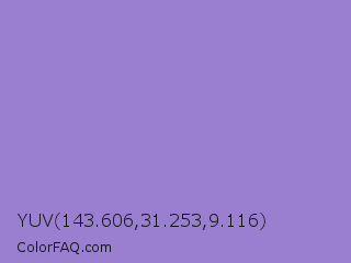 YUV 143.606,31.253,9.116 Color is a light violet color and the nearest color is Lilac Bush #9874d3. Hex code #9a7ecf and RGB value is rgb(154,126,207). In RGB color space, this color is composed of 60% red, 49% green, 81% blue, In CMYK color space, this color is composed of 26% cyan, 39% magenta, 0% yellow , 19% black , In HSL color space, this color has a hue angle of 261° , 46% saturation and 65% lightness.