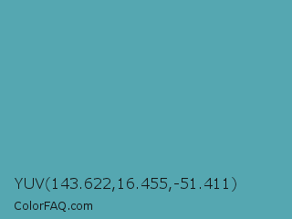 YUV 143.622,16.455,-51.411 Color is a normal cyan color and the nearest color is Hippie Blue #589aaf. Hex code #55a7b1 and RGB value is rgb(85,167,177). In RGB color space, this color is composed of 33% red, 65% green, 69% blue, In CMYK color space, this color is composed of 52% cyan, 6% magenta, 0% yellow , 31% black , In HSL color space, this color has a hue angle of 187° , 37% saturation and 51% lightness.