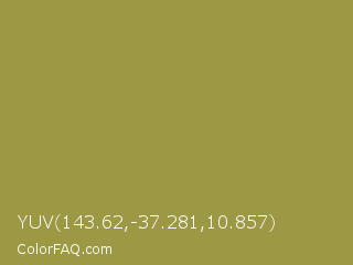 YUV 143.62,-37.281,10.857 Color is a normal yellow color and the nearest color is Sycamore #908d39. Hex code #9c9844 and RGB value is rgb(156,152,68). In RGB color space, this color is composed of 61% red, 60% green, 27% blue, In CMYK color space, this color is composed of 0% cyan, 3% magenta, 56% yellow , 39% black , In HSL color space, this color has a hue angle of 57° , 39% saturation and 44% lightness.