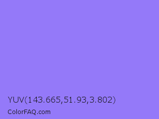 YUV 143.665,51.93,3.802 Color is a light indigo color and the nearest color is Medium Purple #9370db. Hex code #9479f9 and RGB value is rgb(148,121,249). In RGB color space, this color is composed of 58% red, 47% green, 98% blue, In CMYK color space, this color is composed of 41% cyan, 51% magenta, 0% yellow , 2% black , In HSL color space, this color has a hue angle of 253° , 91% saturation and 73% lightness.