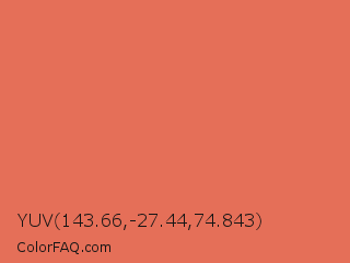 YUV 143.66,-27.44,74.843 Color is a light red color and the nearest color is Terracotta #e2725b. Hex code #e56f58 and RGB value is rgb(229,111,88). In RGB color space, this color is composed of 90% red, 44% green, 35% blue, In CMYK color space, this color is composed of 0% cyan, 52% magenta, 62% yellow , 10% black , In HSL color space, this color has a hue angle of 10° , 73% saturation and 62% lightness.