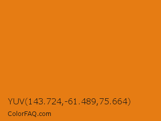 YUV 143.724,-61.489,75.664 Color is a normal orange color and the nearest color is Zest #e5841b. Hex code #e67c13 and RGB value is rgb(230,124,19). In RGB color space, this color is composed of 90% red, 49% green, 7% blue, In CMYK color space, this color is composed of 0% cyan, 46% magenta, 92% yellow , 10% black , In HSL color space, this color has a hue angle of 30° , 85% saturation and 49% lightness.