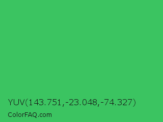 YUV 143.751,-23.048,-74.327 Color is a normal green color and the nearest color is UFO Green #3cd070. Hex code #3bc461 and RGB value is rgb(59,196,97). In RGB color space, this color is composed of 23% red, 77% green, 38% blue, In CMYK color space, this color is composed of 70% cyan, 0% magenta, 51% yellow , 23% black , In HSL color space, this color has a hue angle of 137° , 54% saturation and 50% lightness.