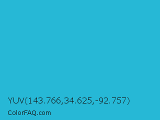 YUV 143.766,34.625,-92.757 Color is a normal cyan color and the nearest color is Scooter #2ebfd4. Hex code #26b8d6 and RGB value is rgb(38,184,214). In RGB color space, this color is composed of 15% red, 72% green, 84% blue, In CMYK color space, this color is composed of 82% cyan, 14% magenta, 0% yellow , 16% black , In HSL color space, this color has a hue angle of 190° , 70% saturation and 49% lightness.