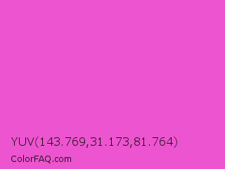 YUV 143.769,31.173,81.764 Color is a light magenta color and the nearest color is Light Deep Pink #ff5ccd. Hex code #ed54cf and RGB value is rgb(237,84,207). In RGB color space, this color is composed of 93% red, 33% green, 81% blue, In CMYK color space, this color is composed of 0% cyan, 65% magenta, 13% yellow , 7% black , In HSL color space, this color has a hue angle of 312° , 81% saturation and 63% lightness.