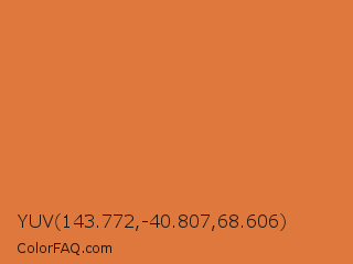 YUV 143.772,-40.807,68.606 Color is a normal orange color and the nearest color is Red Damask #da6a41. Hex code #de783d and RGB value is rgb(222,120,61). In RGB color space, this color is composed of 87% red, 47% green, 24% blue, In CMYK color space, this color is composed of 0% cyan, 46% magenta, 73% yellow , 13% black , In HSL color space, this color has a hue angle of 22° , 71% saturation and 55% lightness.