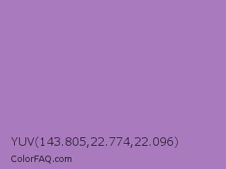 YUV 143.805,22.774,22.096 Color is a light purple color and the nearest color is African Violet #b284be. Hex code #a97abe and RGB value is rgb(169,122,190). In RGB color space, this color is composed of 66% red, 48% green, 75% blue, In CMYK color space, this color is composed of 11% cyan, 36% magenta, 0% yellow , 25% black , In HSL color space, this color has a hue angle of 281° , 34% saturation and 61% lightness.