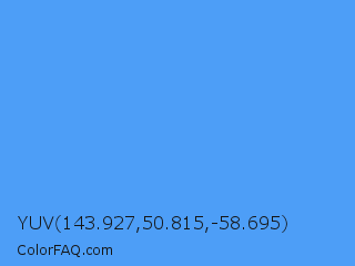 YUV 143.927,50.815,-58.695 Color is a light blue color and the nearest color is Blueberry #4f86f7. Hex code #4d9ef7 and RGB value is rgb(77,158,247). In RGB color space, this color is composed of 30% red, 62% green, 97% blue, In CMYK color space, this color is composed of 69% cyan, 36% magenta, 0% yellow , 3% black , In HSL color space, this color has a hue angle of 211° , 91% saturation and 64% lightness.
