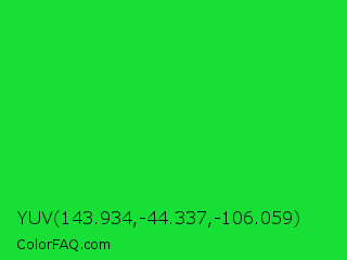 YUV 143.934,-44.337,-106.059 Color is a normal green color and the nearest color is Malachite #0bda51. Hex code #17df36 and RGB value is rgb(23,223,54). In RGB color space, this color is composed of 9% red, 87% green, 21% blue, In CMYK color space, this color is composed of 90% cyan, 0% magenta, 76% yellow , 13% black , In HSL color space, this color has a hue angle of 129° , 81% saturation and 48% lightness.
