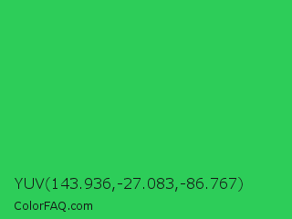 YUV 143.936,-27.083,-86.767 Color is a normal green color and the nearest color is UFO Green #3cd070. Hex code #2dcd59 and RGB value is rgb(45,205,89). In RGB color space, this color is composed of 18% red, 80% green, 35% blue, In CMYK color space, this color is composed of 78% cyan, 0% magenta, 57% yellow , 20% black , In HSL color space, this color has a hue angle of 137° , 64% saturation and 49% lightness.