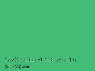 YUV 143.955,-12.303,-67.49 Color is a normal green color and the nearest color is Medium Sea Green #3cb371. Hex code #43bc77 and RGB value is rgb(67,188,119). In RGB color space, this color is composed of 26% red, 74% green, 47% blue, In CMYK color space, this color is composed of 64% cyan, 0% magenta, 37% yellow , 26% black , In HSL color space, this color has a hue angle of 146° , 47% saturation and 50% lightness.