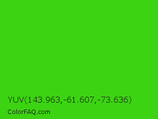YUV 143.963,-61.607,-73.636 Color is a normal green color and the nearest color is Harlequin Green #46cb18. Hex code #3cd313 and RGB value is rgb(60,211,19). In RGB color space, this color is composed of 24% red, 83% green, 7% blue, In CMYK color space, this color is composed of 72% cyan, 0% magenta, 91% yellow , 17% black , In HSL color space, this color has a hue angle of 107° , 83% saturation and 45% lightness.