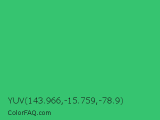 YUV 143.966,-15.759,-78.9 Color is a normal green color and the nearest color is UFO Green #3cd070. Hex code #36c470 and RGB value is rgb(54,196,112). In RGB color space, this color is composed of 21% red, 77% green, 44% blue, In CMYK color space, this color is composed of 72% cyan, 0% magenta, 43% yellow , 23% black , In HSL color space, this color has a hue angle of 145° , 57% saturation and 49% lightness.