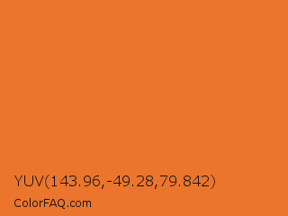 YUV 143.96,-49.28,79.842 Color is a normal orange color and the nearest color is Vivid Tangelo #f07427. Hex code #eb752c and RGB value is rgb(235,117,44). In RGB color space, this color is composed of 92% red, 46% green, 17% blue, In CMYK color space, this color is composed of 0% cyan, 50% magenta, 81% yellow , 8% black , In HSL color space, this color has a hue angle of 23° , 83% saturation and 55% lightness.