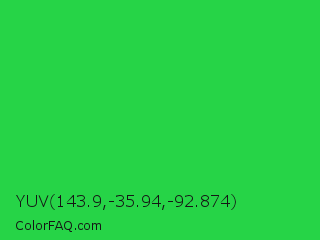 YUV 143.9,-35.94,-92.874 Color is a normal green color and the nearest color is Lime Green #32cd32. Hex code #26d447 and RGB value is rgb(38,212,71). In RGB color space, this color is composed of 15% red, 83% green, 28% blue, In CMYK color space, this color is composed of 82% cyan, 0% magenta, 67% yellow , 17% black , In HSL color space, this color has a hue angle of 131° , 70% saturation and 49% lightness.