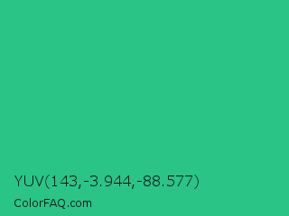 YUV 143,-3.944,-88.577 Color is a normal green color and the nearest color is Mountain Meadow #30ba8f. Hex code #2ac487 and RGB value is rgb(42,196,135). In RGB color space, this color is composed of 16% red, 77% green, 53% blue, In CMYK color space, this color is composed of 79% cyan, 0% magenta, 31% yellow , 23% black , In HSL color space, this color has a hue angle of 156° , 65% saturation and 47% lightness.