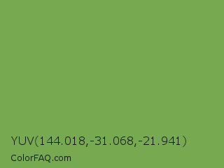 YUV 144.018,-31.068,-21.941 Color is a normal green color and the nearest color is Asparagus Green #7ba05b. Hex code #77a951 and RGB value is rgb(119,169,81). In RGB color space, this color is composed of 47% red, 66% green, 32% blue, In CMYK color space, this color is composed of 30% cyan, 0% magenta, 52% yellow , 34% black , In HSL color space, this color has a hue angle of 94° , 35% saturation and 49% lightness.