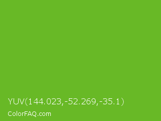 YUV 144.023,-52.269,-35.1 Color is a normal green color and the nearest color is Green RYB #66b032. Hex code #68b926 and RGB value is rgb(104,185,38). In RGB color space, this color is composed of 41% red, 73% green, 15% blue, In CMYK color space, this color is composed of 44% cyan, 0% magenta, 79% yellow , 27% black , In HSL color space, this color has a hue angle of 93° , 66% saturation and 44% lightness.