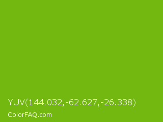 YUV 144.032,-62.627,-26.338 Color is a normal green color and the nearest color is Lima #76bd17. Hex code #72b811 and RGB value is rgb(114,184,17). In RGB color space, this color is composed of 45% red, 72% green, 7% blue, In CMYK color space, this color is composed of 38% cyan, 0% magenta, 91% yellow , 28% black , In HSL color space, this color has a hue angle of 85° , 83% saturation and 39% lightness.