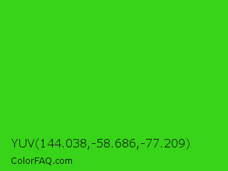 YUV 144.038,-58.686,-77.209 Color is a normal green color and the nearest color is Harlequin Green #46cb18. Hex code #38d419 and RGB value is rgb(56,212,25). In RGB color space, this color is composed of 22% red, 83% green, 10% blue, In CMYK color space, this color is composed of 74% cyan, 0% magenta, 88% yellow , 17% black , In HSL color space, this color has a hue angle of 110° , 79% saturation and 46% lightness.