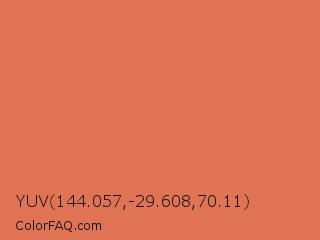 YUV 144.057,-29.608,70.11 Color is a normal red color and the nearest color is Terracotta #e2725b. Hex code #e07354 and RGB value is rgb(224,115,84). In RGB color space, this color is composed of 88% red, 45% green, 33% blue, In CMYK color space, this color is composed of 0% cyan, 49% magenta, 63% yellow , 12% black , In HSL color space, this color has a hue angle of 13° , 69% saturation and 60% lightness.
