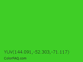 YUV 144.091,-52.303,-71.117 Color is a normal green color and the nearest color is Harlequin Green #46cb18. Hex code #3fce26 and RGB value is rgb(63,206,38). In RGB color space, this color is composed of 25% red, 81% green, 15% blue, In CMYK color space, this color is composed of 69% cyan, 0% magenta, 82% yellow , 19% black , In HSL color space, this color has a hue angle of 111° , 69% saturation and 48% lightness.