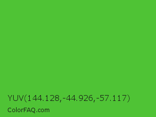 YUV 144.128,-44.926,-57.117 Color is a normal green color and the nearest color is Apple #4fa83d. Hex code #4fc335 and RGB value is rgb(79,195,53). In RGB color space, this color is composed of 31% red, 76% green, 21% blue, In CMYK color space, this color is composed of 59% cyan, 0% magenta, 73% yellow , 24% black , In HSL color space, this color has a hue angle of 109° , 57% saturation and 49% lightness.