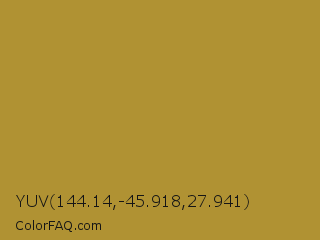 YUV 144.14,-45.918,27.941 Color is a normal yellow color and the nearest color is Alpine #af8f2c. Hex code #b09233 and RGB value is rgb(176,146,51). In RGB color space, this color is composed of 69% red, 57% green, 20% blue, In CMYK color space, this color is composed of 0% cyan, 17% magenta, 71% yellow , 31% black , In HSL color space, this color has a hue angle of 46° , 55% saturation and 45% lightness.