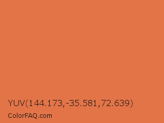 YUV 144.173,-35.581,72.639 Color is a normal orange color and the nearest color is Burnt Sienna #e97451. Hex code #e37448 and RGB value is rgb(227,116,72). In RGB color space, this color is composed of 89% red, 45% green, 28% blue, In CMYK color space, this color is composed of 0% cyan, 49% magenta, 68% yellow , 11% black , In HSL color space, this color has a hue angle of 17° , 73% saturation and 59% lightness.