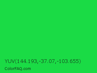 YUV 144.193,-37.07,-103.655 Color is a normal green color and the nearest color is Malachite #0bda51. Hex code #1adb45 and RGB value is rgb(26,219,69). In RGB color space, this color is composed of 10% red, 86% green, 27% blue, In CMYK color space, this color is composed of 88% cyan, 0% magenta, 68% yellow , 14% black , In HSL color space, this color has a hue angle of 133° , 79% saturation and 48% lightness.