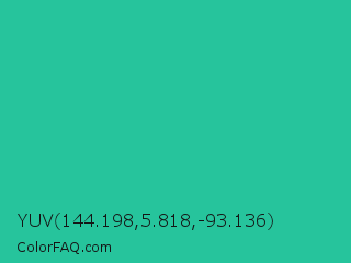 YUV 144.198,5.818,-93.136 Color is a normal cyan color and the nearest color is Shamrock #33cc99. Hex code #26c49c and RGB value is rgb(38,196,156). In RGB color space, this color is composed of 15% red, 77% green, 61% blue, In CMYK color space, this color is composed of 81% cyan, 0% magenta, 20% yellow , 23% black , In HSL color space, this color has a hue angle of 165° , 68% saturation and 46% lightness.
