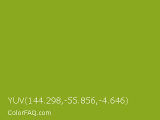 YUV 144.298,-55.856,-4.646 Color is a normal lime color and the nearest color is Citron #9fa91f. Hex code #8ba91f and RGB value is rgb(139,169,31). In RGB color space, this color is composed of 55% red, 66% green, 12% blue, In CMYK color space, this color is composed of 18% cyan, 0% magenta, 82% yellow , 34% black , In HSL color space, this color has a hue angle of 73° , 69% saturation and 39% lightness.