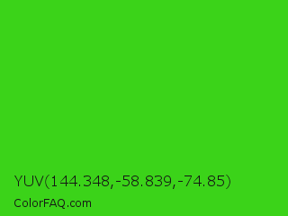YUV 144.348,-58.839,-74.85 Color is a normal green color and the nearest color is Harlequin Green #46cb18. Hex code #3bd319 and RGB value is rgb(59,211,25). In RGB color space, this color is composed of 23% red, 83% green, 10% blue, In CMYK color space, this color is composed of 72% cyan, 0% magenta, 88% yellow , 17% black , In HSL color space, this color has a hue angle of 109° , 79% saturation and 46% lightness.