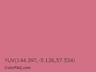 YUV 144.397,-5.126,57.534 Color is a light red color and the nearest color is Charm #d47494. Hex code #d27186 and RGB value is rgb(210,113,134). In RGB color space, this color is composed of 82% red, 44% green, 53% blue, In CMYK color space, this color is composed of 0% cyan, 46% magenta, 36% yellow , 18% black , In HSL color space, this color has a hue angle of 347° , 52% saturation and 63% lightness.