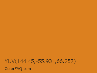YUV 144.45,-55.931,66.257 Color is a normal orange color and the nearest color is Zest #e5841b. Hex code #dc801f and RGB value is rgb(220,128,31). In RGB color space, this color is composed of 86% red, 50% green, 12% blue, In CMYK color space, this color is composed of 0% cyan, 42% magenta, 86% yellow , 14% black , In HSL color space, this color has a hue angle of 31° , 75% saturation and 49% lightness.