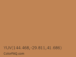 YUV 144.468,-29.811,41.686 Color is a normal orange color and the nearest color is Deer #ba8759. Hex code #c08454 and RGB value is rgb(192,132,84). In RGB color space, this color is composed of 75% red, 52% green, 33% blue, In CMYK color space, this color is composed of 0% cyan, 31% magenta, 56% yellow , 25% black , In HSL color space, this color has a hue angle of 27° , 46% saturation and 54% lightness.