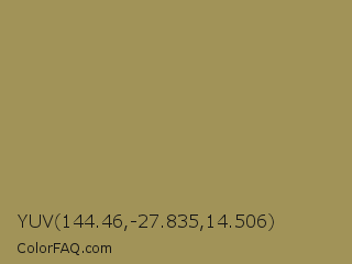 YUV 144.46,-27.835,14.506 Color is a normal yellow color and the nearest color is Barley Corn #a68b5b. Hex code #a19358 and RGB value is rgb(161,147,88). In RGB color space, this color is composed of 63% red, 58% green, 35% blue, In CMYK color space, this color is composed of 0% cyan, 9% magenta, 45% yellow , 37% black , In HSL color space, this color has a hue angle of 48° , 29% saturation and 49% lightness.