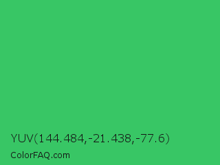 YUV 144.484,-21.438,-77.6 Color is a normal green color and the nearest color is UFO Green #3cd070. Hex code #38c665 and RGB value is rgb(56,198,101). In RGB color space, this color is composed of 22% red, 78% green, 40% blue, In CMYK color space, this color is composed of 72% cyan, 0% magenta, 49% yellow , 22% black , In HSL color space, this color has a hue angle of 139° , 56% saturation and 50% lightness.