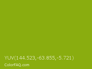 YUV 144.523,-63.855,-5.721 Color is a normal lime color and the nearest color is Apple Green #8db600. Hex code #8aad0f and RGB value is rgb(138,173,15). In RGB color space, this color is composed of 54% red, 68% green, 6% blue, In CMYK color space, this color is composed of 20% cyan, 0% magenta, 91% yellow , 32% black , In HSL color space, this color has a hue angle of 73° , 84% saturation and 37% lightness.