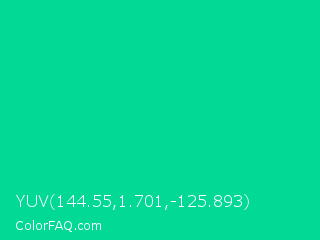 YUV 144.55,1.701,-125.893 Color is a normal green color and the nearest color is Caribbean Green #00cc99. Hex code #01d994 and RGB value is rgb(1,217,148). In RGB color space, this color is composed of 0% red, 85% green, 58% blue, In CMYK color space, this color is composed of 100% cyan, 0% magenta, 32% yellow , 15% black , In HSL color space, this color has a hue angle of 161° , 99% saturation and 43% lightness.